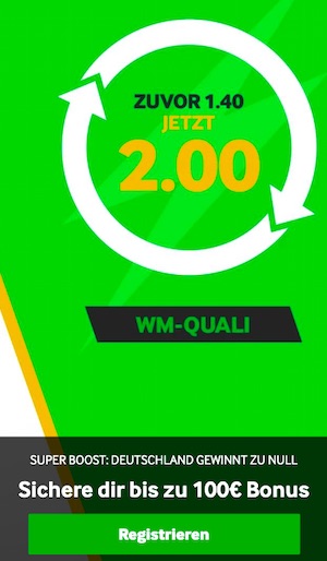 Betway ist grundsätzlich bekannt dafür immer wieder top Quotenboosts auf den Markt zu bringen. Die Quote wird dabei im Vergleich zur Konkurrenz ordentlich erhöht. Warum also nicht einfach mitmachen? Geht ihr davon aus, dass Deutschland gegen Nordmazedonien gewinnt und dabei keinen Gegentreffer hinnehmen muss? Kein Problem, bei Betway seid ihr richtig!